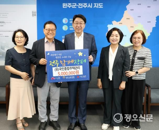 (유)국민종합주택관리는 5일 전주시장실을 방문해 지역경제 활성화와 연대의 소비문화 확산을 위한 ‘전주함께장터’ 운영 기부금 500만 원을 전달했다.