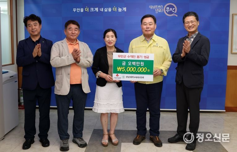 정오신문 관리자 기자 | 전남 무안군은 5일 전남대학교 총동창회(회장 류혜경)로부터 집중호우 피해로 어려움을 겪고 있는 군민들을 돕기 위한 성금 500만 원을 기탁받았다.