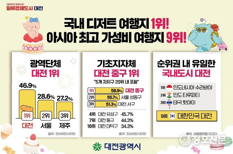 여행 리서치 전문 기관인 컨슈머인사이트가 실시한 ‘2025 여행자·현지인의 국내 여행지 평가 및 추천조사’에 따르면, 대전시는 디저트류 추천 광역시 부문에서 46.9%의 추천율로 1위를 차지했다.