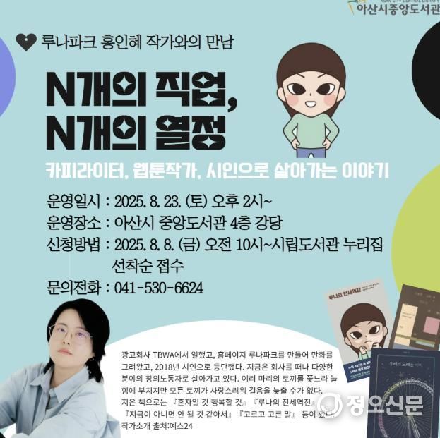 정오신문 관리자 기자 | 아산시립도서관이 23일 오후 2시, 중앙도서관에서 청년 대상 인문학 특강 ‘루나파크 홍인혜 작가와의 만남-N개의 직업, N개의 열정’을 운영한다.