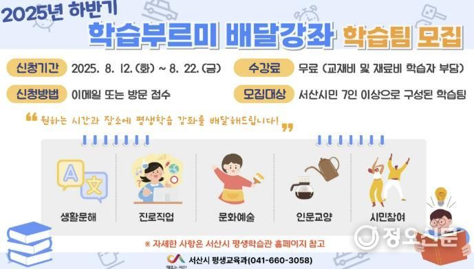 정오신문 관리자 기자 | 충남 서산시는 오는 12일부터 22일까지 2025년 하반기 학습부르미 배달강좌 학습팀을 모집한다고 밝혔다.