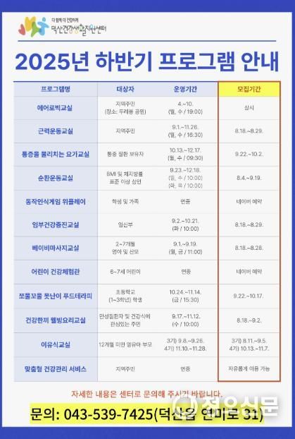덕산 건강생활지원센터는 주민참여형 건강증진 활동과 지역기관 협력을 기반으로 한 지역 건강 거버넌스 구축에 힘쓰고 있으며, 이번 하반기 프로그램 역시 지역 특성과 주민 수요를 반영해 마련됐다.
