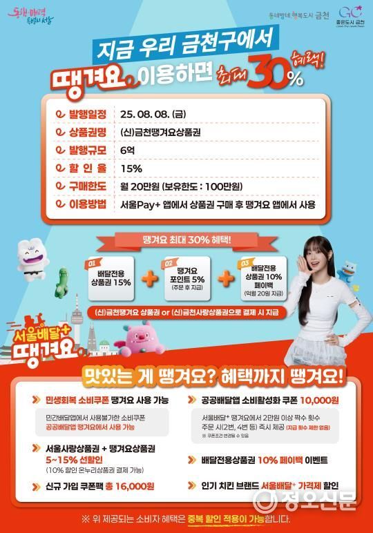 금천땡겨요상품권은 공공배달 앱 ‘땡겨요’에서 음식을 주문할 때 사용할 수 있는 모바일 전용 상품권이다. 서울페이플러스(서울Pay+) 앱에서 1인당 월 20만 원씩 구매할 수 있다. 보유 한도는 100만 원이다.