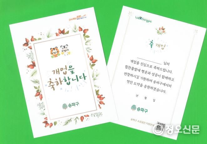 정오신문 관리자 기자 | 송파구는 새로 문을 여는 소규모 자영업자에게 ‘원스톱 민원 신규업소 개업 축하카드’를 전달한다고 밝혔다.