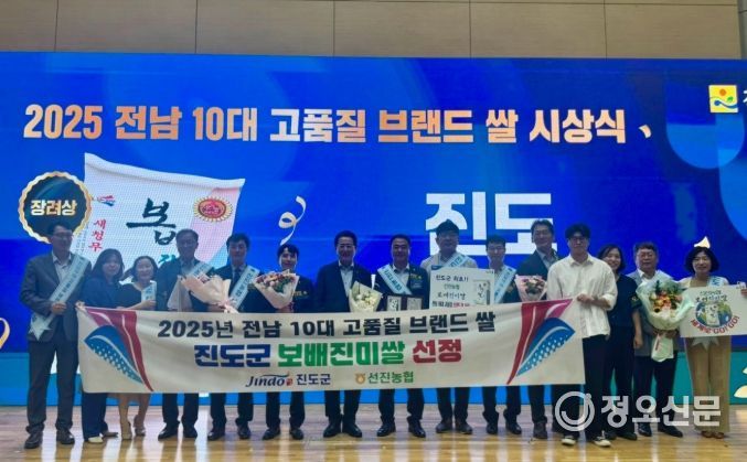 정오신문 관리자 기자 | 진도군은 전라남도가 주관한 ‘2025년 전남 10대 고품질 브랜드 쌀’ 시상식에서 진도군의 대표 쌀 브랜드인 ‘보배진미쌀’이 최초로 상을 받았다고 밝혔다.