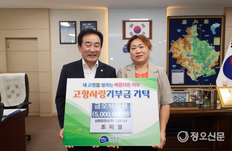 정오신문 관리자 기자 | ㈜삼화정공사 조미영 대표는 6일 진천군청을 방문해 고향사랑기부금 500만원을 기탁했다.