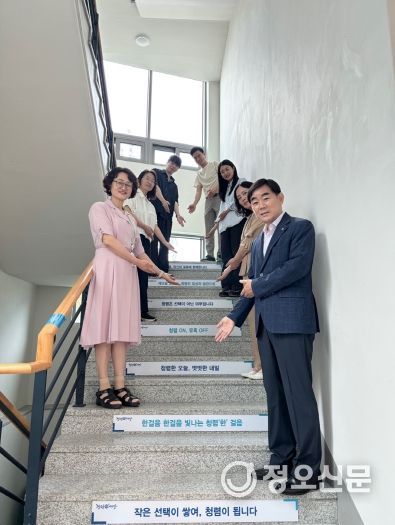 정오신문 관리자 기자 | 진천교육지원청은 8월 6일, 생활 속에서 청렴을 실천하고 체감할 수 있는 환경을 조성하기 위해 학교지원센터에 청렴 디딤돌(청렴 계단)을 설치했다.