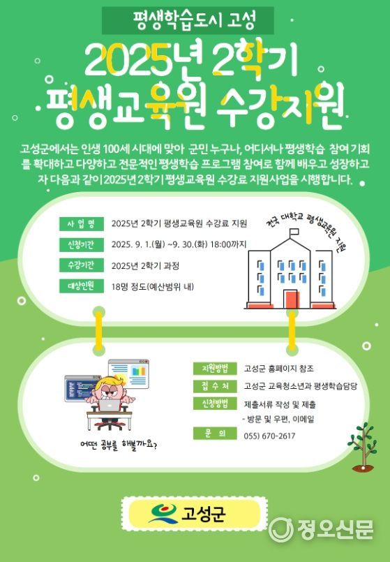 정오신문 관리자 기자 | 고성군은 군민들의 평생학습 참여를 촉진하고 학습도시로서의 기반을 강화하고자, 2025년 2학기 평생교육원 수강료 지원사업 신청을 9월 1일부터 9월 30일까지 접수한다고 밝혔다.
