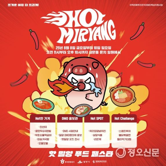이번 행사는 삼양식품의 불닭볶음면, 무안면 맛나고추, 밀양돼지국밥, 햇살문화도시 등 밀양의 ‘맵고 뜨거운’ 이미지를 활용해 ‘Hot Miryang’이라는 새로운 관광브랜드로 관광객을 맞이할 예정이다.