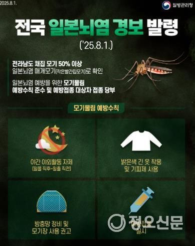 군 관계자는 “여름철 야외 활동 시 일본뇌염 매개 모기에 노출될 가능성이 높아지므로 기피제 사용 등 모기물림 예방수칙을 실천해 주시길 바란다”며 “예방접종 대상자는 접종 일정에 맞춰 예방접종을 완료할 수 있도록 적극적인 협조를 부탁드린다”고 말했다.