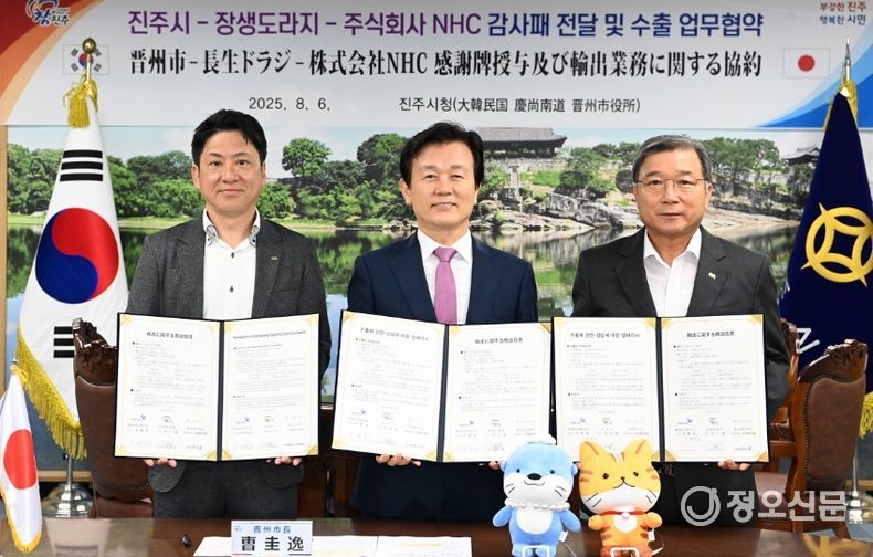 이날 협약식에는 조규일 진주시장이 참석해 일본 내 진주시 제품의 인지도 제고와 수출 확대에 기여한 ㈜NHC에 감사패도 전달했다.