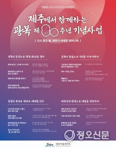 정오신문 관리자 기자 | 제주특별자치도가 올해 광복 80주년을 맞아 ‘다시 찾은 빛! 제주의 미래로 피어나라’라는 슬로건으로 조국 독립의 정신을 계승하는 종합적인 기념사업을 추진한다.
