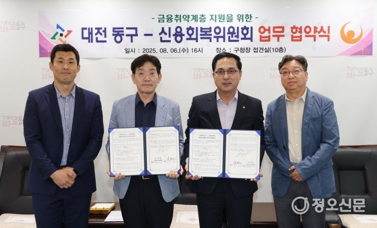 정오신문 관리자 기자 | 대전 동구는 6일 신용회복위원회 대전충청지역본부(본부장 이승욱)와 금융 취약계층 지원을 위한 업무협약을 체결했다고 밝혔다.