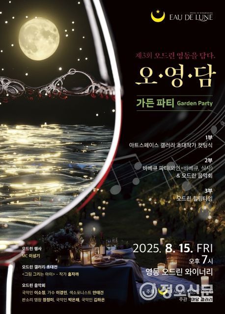 정오신문 관리자 기자 | 충북 영동군 황간면에 위치한 오드린 와이너리에서 오는 15일 오후 7시, 영동의 문화와 특산물, 예술이 어우러지는 특별한 축제 제3회 ‘오드린, 영동을 담다(오영담)’ 가든파티가 개최된다.