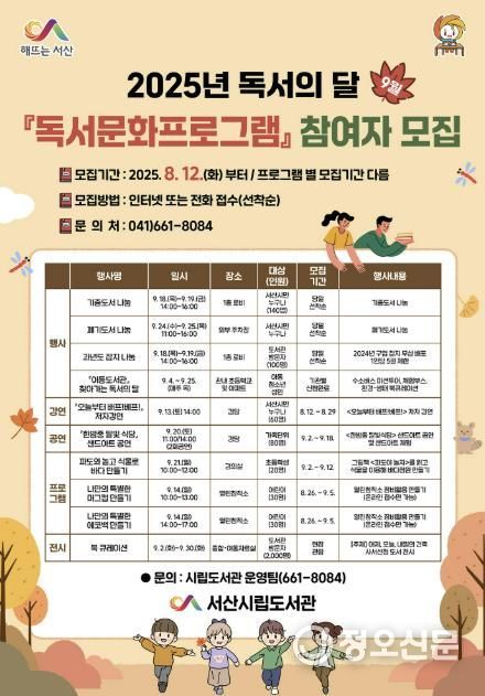 정오신문 관리자 기자 | 충남 서산시는 독서의 달 9월을 맞아 시립도서관에서 다채로운 독서 문화 프로그램을 운영한다고 7일 밝혔다.