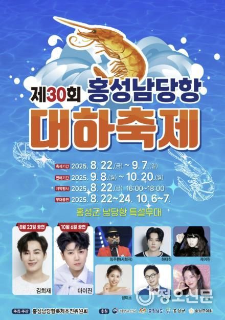 군에 따르면 서부면 남당항 일원에서 오는 8월 22일부터 9월 7일까지 제30회 홍성남당항 대하축제가 화려하게 개최된다.