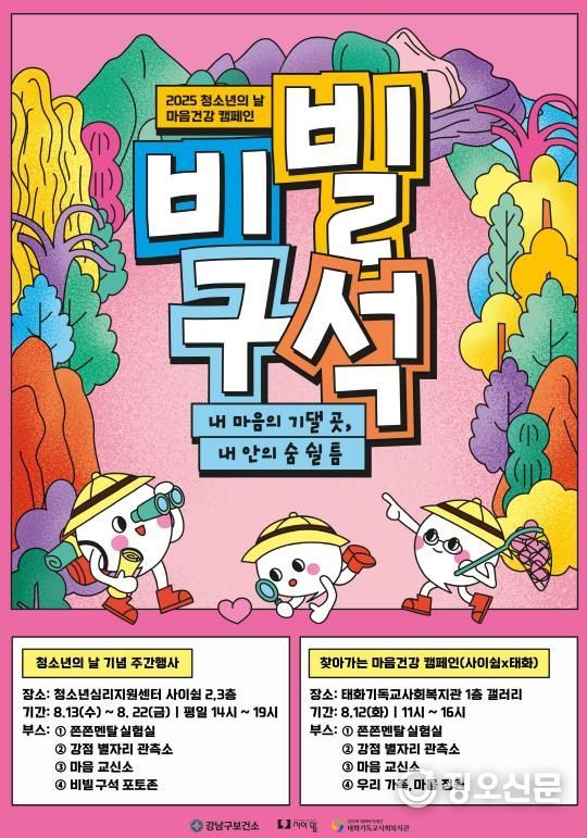 조성명 강남구청장은 “이번 캠페인은 치열한 일상 속에서 흔들리는 청소년들에게 잠시 쉬어갈 수 있는 정서적 쉼터가 되어줄 것”이라며 “앞으로도 청소년 정신건강에 대한 관심과 지원을 아끼지 않고, 모든 청소년이 마음 놓고 기대어 설 수 있는 ‘비빌 구석’이 있는 도시를 만들어 가겠다”고 밝혔다.