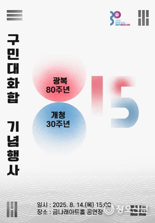 구는 14일 오후 3시 금나래아트홀 공연장에서 광복 80주년, 개청 30주년 구민 대화합 기념행사를 연다. 이날 행사에는 다양한 계층의 주민 500여 명이 참석해 나라 사랑 정신을 되새기고, 독립유공자에 대한 감사와 존경을 전하는 시간을 가질 예정이다.