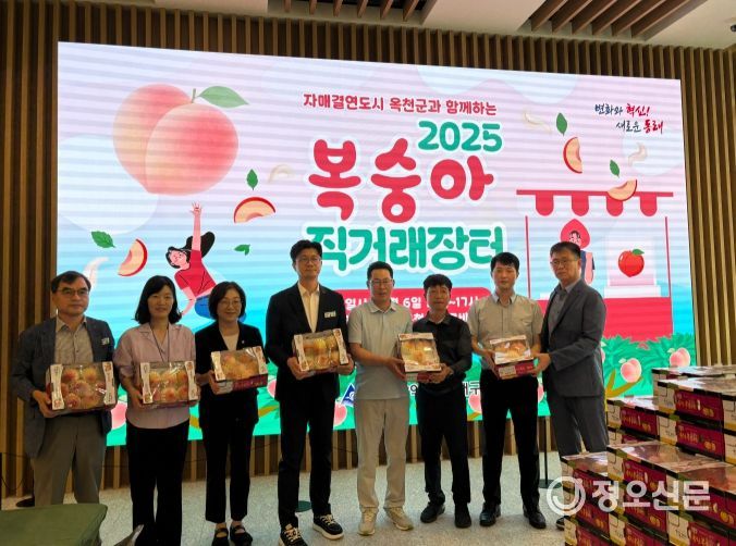 정오신문 관리자 기자 | 옥천군은 지난 6일, 부산광역시 동래구청 1층 로비에서 ‘옥천복숭아 직거래장터’를 운영했다.