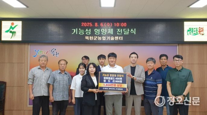 정오신문 관리자 기자 | 지난 6일 옥천군 소재 충북농자재(대표 김두열)와 대전시 소재 ㈜엠테코트(대표 이혁주)가 관내 농업인을 위해 600만 원 상당의 칼마붕골드 400병(500㎖)과 1,200만 원 상당의 엠도리 800병(500㎖)을 옥천군포도연합회(회장 이정민)에 전달했다.