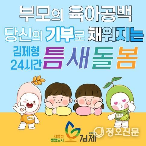 한편, 지정기부사업은 고향사랑e음에 접속해 특정사업에 기부하기를 선택하고 전북특별자치도 김제시의 ‘부모의 육아공백 당신의 기부로 채워지는 김제형 24시간 틈새돌봄’이라 적힌 이미지의 사업을 선택하거나 ‘김제 365일 24시간 아이돌봄센터 운영’을 검색하여 사업에 기부할 수 있다.