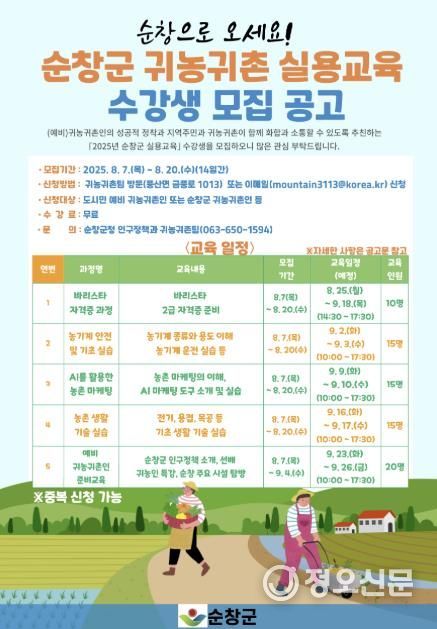 모집 대상은 도시민 예비 귀농·귀촌인 및 순창군에 거주 중인 귀농·귀촌인으로, 수강료는 전액 무료이며 일부 과정은 자격증 취득도 가능하다.