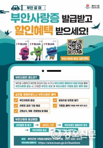 권익현 부안군수는 “부안사랑인 제도는 군민과 방문객이 함께 누리는 생활인구 연계형 지역경제 활성화 정책”이라며 “지속적인 가맹점 확대와 맞춤형 이벤트로 부안을 찾는 발길이 늘고, 지속적인 방문으로 이어지길 희망한다 ”고 밝혔다.