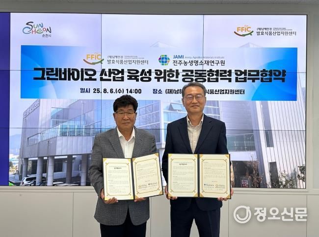 정오신문 관리자 기자 | (재)남해안권발효식품산업지원센터는 지난 6일 센터 회의실에서 순천시가 중점적으로 키우고 있는 그린바이오 산업과 발효식품 산업의 활성화를 위해 (재)전주농생명소재연구원과 업무협약을 체결했다고 밝혔다.