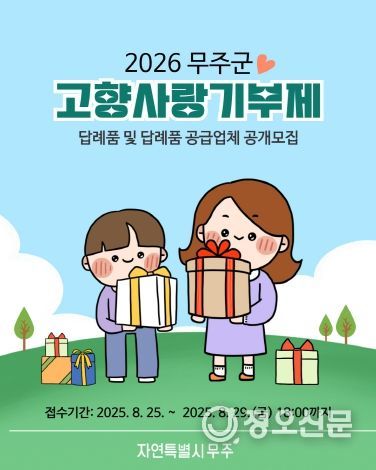 정오신문 관리자 기자 | 무주군이 고향사랑기부제 활성화를 위해 오는 8월 29일까지 답례품 및 공급업체를 공개 모집한다고 밝혔다. 8월 25일부터 5일간 무주군청 자치행정과 고향사랑팀으로 직접 방문·신청하면 되며 모집 분야는 △농·축·수·임산물, △가공식품, △공예품, △관광 및 체험 서비스 등이다.