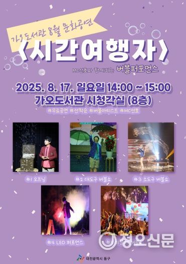 정오신문 관리자 기자 | 대전 동구는 오는 17일 오후 2시 가오도서관 시청각실에서 여름방학을 맞은 어린이와 지역 주민을 위한 문화공연 버블퍼포먼스 ‘시간여행자’를 개최한다고 7일 밝혔다.