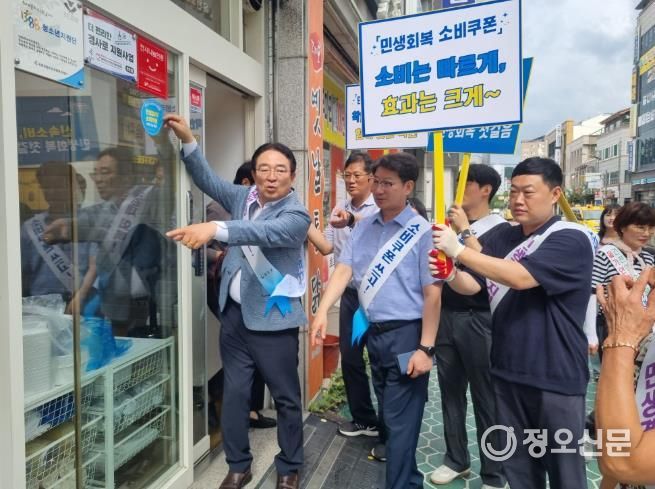 정오신문 관리자 기자 | 7일 옥천군은 지역경제의 빠른 회복과 물가안정 분위기 확산을 위해 옥천읍 시가지에서 '민생회복 소비쿠폰 신속사용 캠페인'을 개최했다.