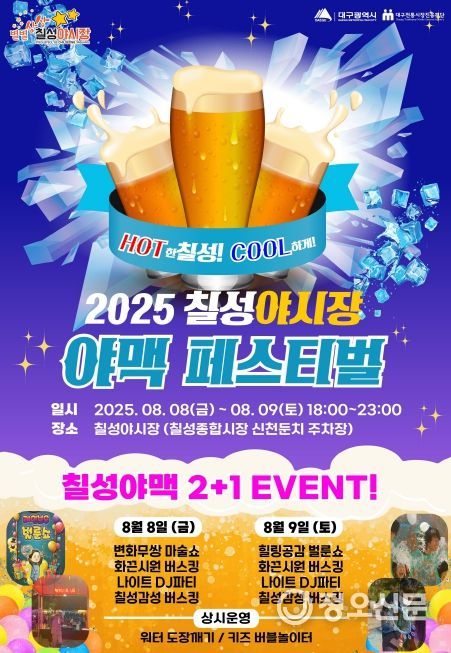 정오신문 관리자 기자 | 대구광역시와 대구전통시장진흥재단은 연이은 폭염으로 무더위에 지친 시민들이 더위를 한방에 날려버릴 수 있도록 ‘2025 칠성야시장 야맥 페스티벌’을 8월 8일, 9일 양일간 칠성야시장 일원에서 개최한다.