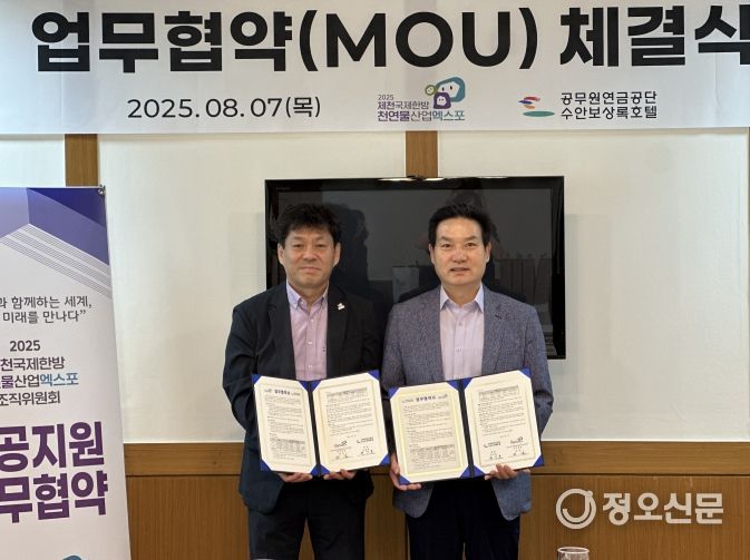 정오신문 관리자 기자 | 2025 제천국제한방천연물산업엑스포조직위원회(사무총장 정길)는 7일 수안보상록호텔에서 공무원연금공단 수안보상록호텔(대표 전인호)와 엑스포 성공개최와 지역 관광 활성화를 위한 업무협약을 체결했다.