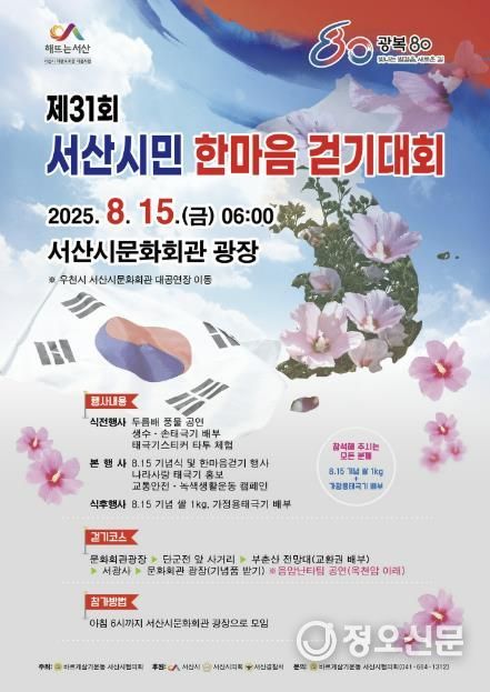 정오신문 관리자 기자 | 충남 서산시는 광복 80주년을 맞아 제31회 서산시민 한마음 걷기대회를 개최한다고 밝혔다.