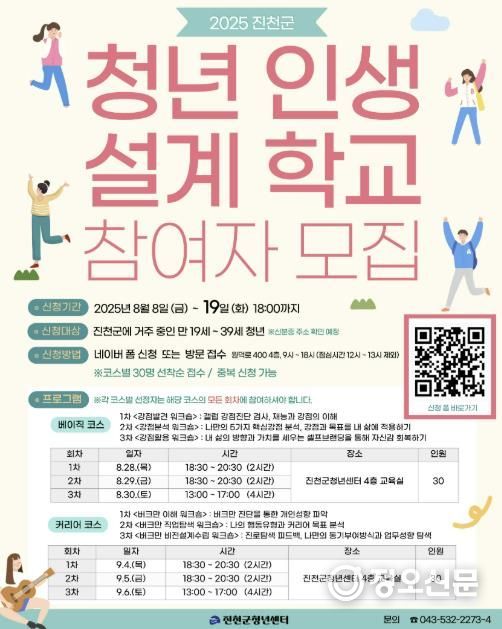 정오신문 관리자 기자 | 충북 진천군이 청년 개인별 장점을 발견하고, 다양한 진로설계를 지원하기 위해 ‘2025 청년인생설계학교’참가자를 8월 19일까지 모집한다.