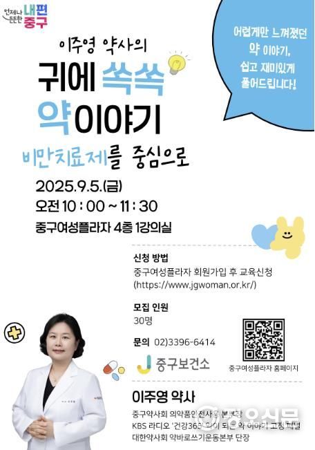 서울 중구가 다음달 5일(금) 오전 10시 중구여성플라자 4층에서 중구민과 생활권자를 대상으로 '귀에 쏙쏙 약 이야기' 건강특강을 개최한다.