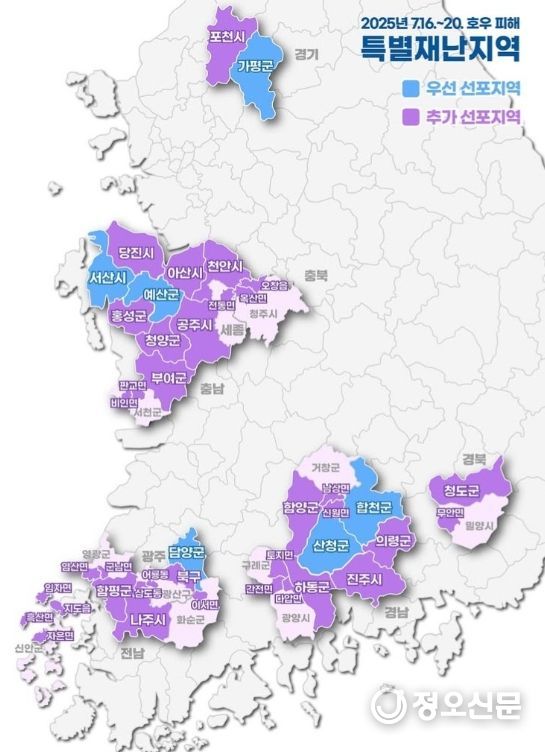 이번 선포는 행정안전부가 7월 27일부터 8월 2일까지 실시한 중앙합동피해조사 결과를 반영한 것으로, 광주, 경기, 세종, 충북, 충남, 전남, 경북, 경남 등 8개 시·도 16개 시·군·구, 20개 읍·면·동 지역이 함께 특별재난지역으로 추가 지정되었다.
