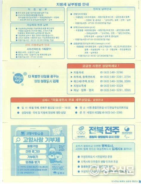 정오신문 관리자 기자 | 김제시는 이달 발송되는 주민세 고지서부터 청렴 문구를 삽입해 납세자에게 투명한 세정 행정과 신뢰의 메시지를 전할 계획이라고 8일 밝혔다.