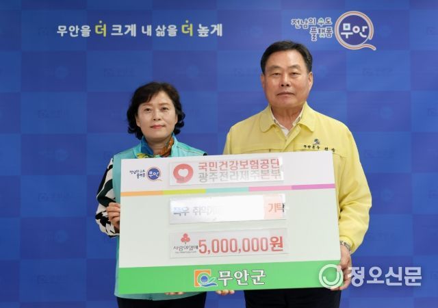 정오신문 관리자 기자 | 전남 무안군은 지난 7일, 국민건강보험공단 광주전라제주지역본부(본부장 이영희)로부터 집중호우로 어려움을 겪고 있는 지역 내 주민을 위한 성금 500만원을 기탁받았다.
