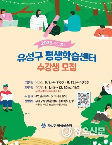 정오신문 관리자 기자 | 대전 유성구는 오는 13일까지 구암평생학습센터와 전민평생학습센터에서 운영하는 ‘2025년도 3기 평생학습센터’ 수강생을 모집한다.