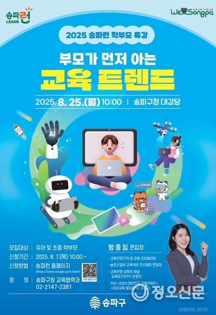 서강석 송파구청장은 “빠르게 변화하는 교육 환경 속에서, 부모가 먼저 흐름을 읽고 자녀의 미래를 준비하는 것이 그 어느 때보다 중요해졌다”며, “이번 특강을 통해서 미래 교육의 방향을 통찰하고, 자녀에게 꼭 필요한 교육적 지원을 고민하는 계기가 되길 바란다”고 전했다.