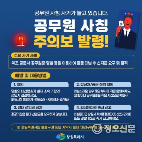 시 관계자는 “창원시를 비롯한 모든 공공기관은 계약이나 물품 구매 과정에서 절대 선금을 요구하지 않는다”며, “의심스러운 연락을 받았을 경우 즉시 창원시청 자치행정과 또는 경찰에 신고하고, 반드시 공식 연락처를 통해 사실 여부를 확인해 달라”고 강조했다.