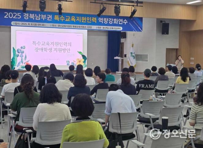 정오신문 관리자 기자 | 경산교육지원청 특수교육지원센터는 8월 8일 학생교육지원관 2강당에서 경북 남부권(경산, 영천, 경주, 청도) 유, 초, 중, 고등학교 및 특수학교의 특수교육실무사 94명 및 사회복무요원 10명을 대상으로 ‘특수교육지원인력 역량 강화 연수’를 실시했다.