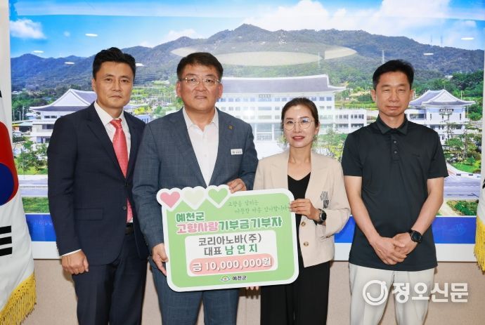 정오신문 관리자 기자 | 지속가능한 생태농업 기술을 선도하고 있는 ㈜코리아노바(대표 남연지)에서 8일, 예천군청을 찾아 고향사랑기부금에 1천만 원을 기탁했다.