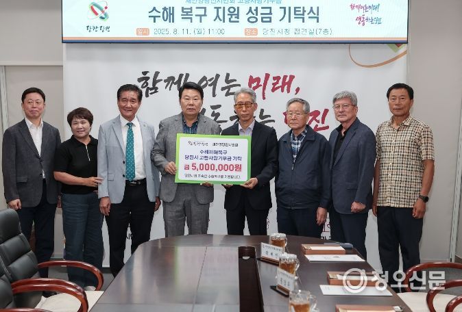 정오신문 관리자 기자 | 당진시는 재안양당진시민회(회장 이병칠)가 당진시 폭우 피해 복구를 지원하기 위해 11일 당진시청 접견실에서 고향사랑기부금 500만 원을 전달했다고 밝혔다.