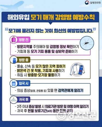 해외여행 시에는 긴 옷 착용, 모기 기피제 사용, 방충망·모기장 설치 확인 등 모기 회피 수칙을 지켜야 한다.