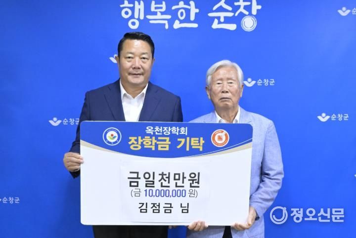 정오신문 관리자 기자 | 순창군은 11일 팔덕면 용두마을에 거주하는 김점금 어르신이 (재)순창군 옥천장학회에 장학금 1천만 원을 기탁했다고 밝혔다.