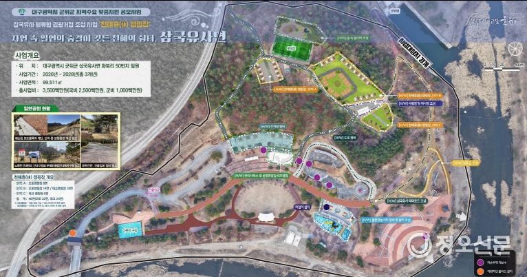 군위군 공항도시개발과에서 지난 5월 공모 신청한 ‘삼국유사 체류형 거점조성사업’은 지역 자원인 일연공원을 활용하여 캠핑장, 물환경놀이터, 테마로드 등을 조성하여, 일연공원의 재생과 하천변 노지 캠핑 양성화, 최종적으로는 지역 내 체류 인구 증가를 유도하는 지역개발사업이다.