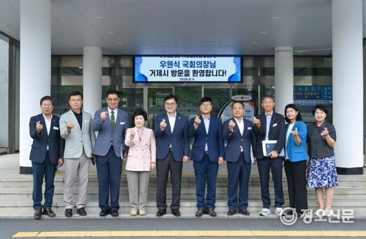 11일 오후 거제시청을 찾은 우 의장은 변광용 거제시장, 신금자 거제시의회의장을 비롯한 국·소장들과 지역현안 간담회를 가졌다.