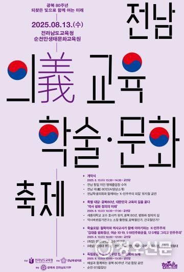 정오신문 관리자 기자 | 전라남도교육청은 13~14일 순천만생태문화교육원에서 ‘광복 80주년 되찾은 빛으로 함께 여는 미래’를 주제로 전남 의(義)교육 학술·문화 축제를 개최한다.